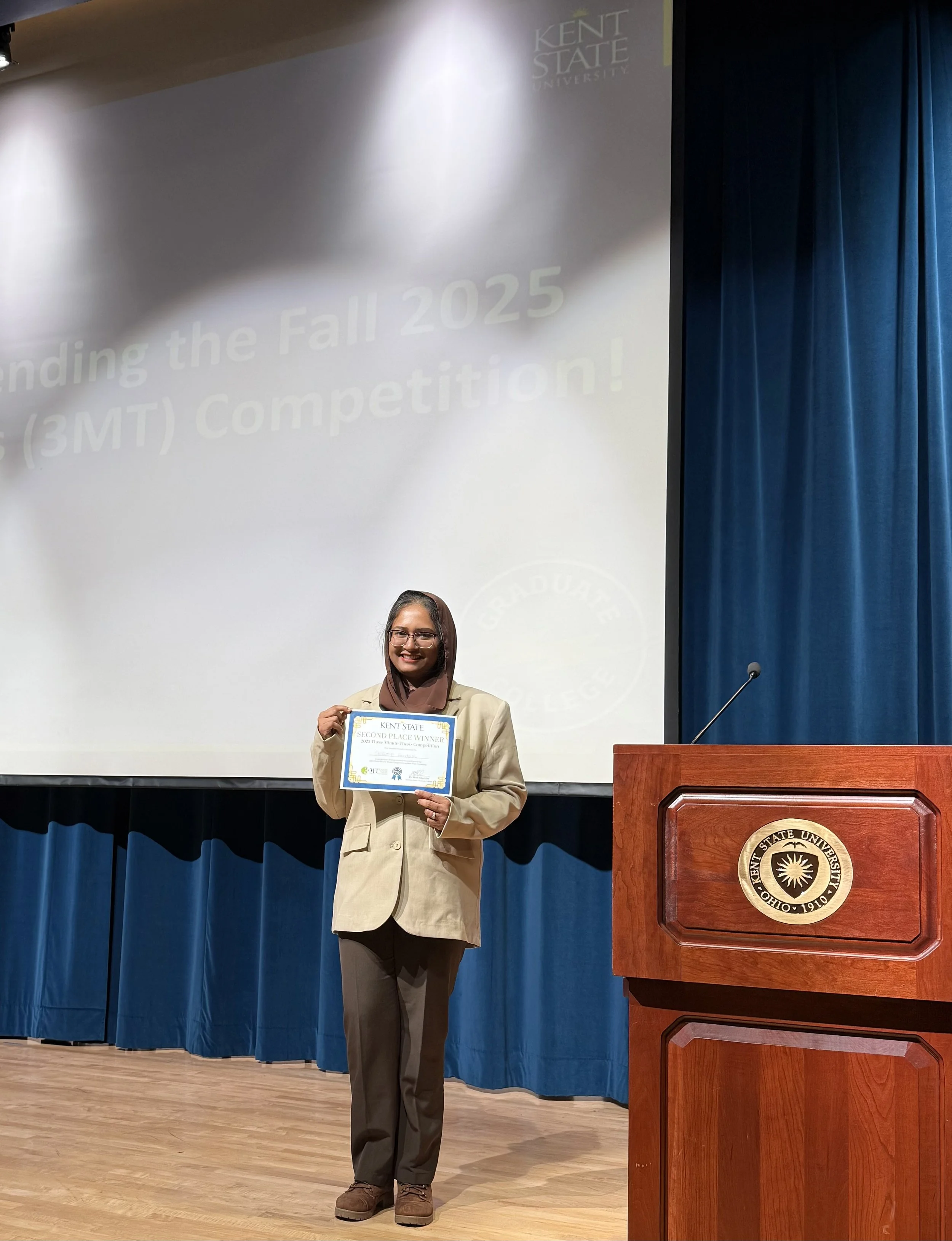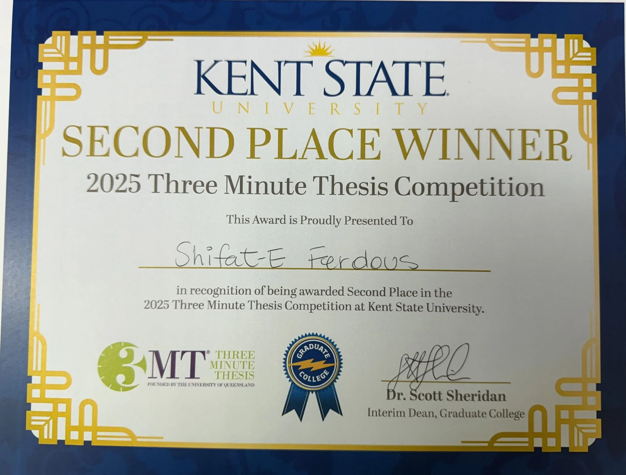 Ph.D. candidate Shifat-E Ferdous wins 2nd place at Kent State University’s “Three Minute Thesis” competition. Check her out here, and congrats Shifat!